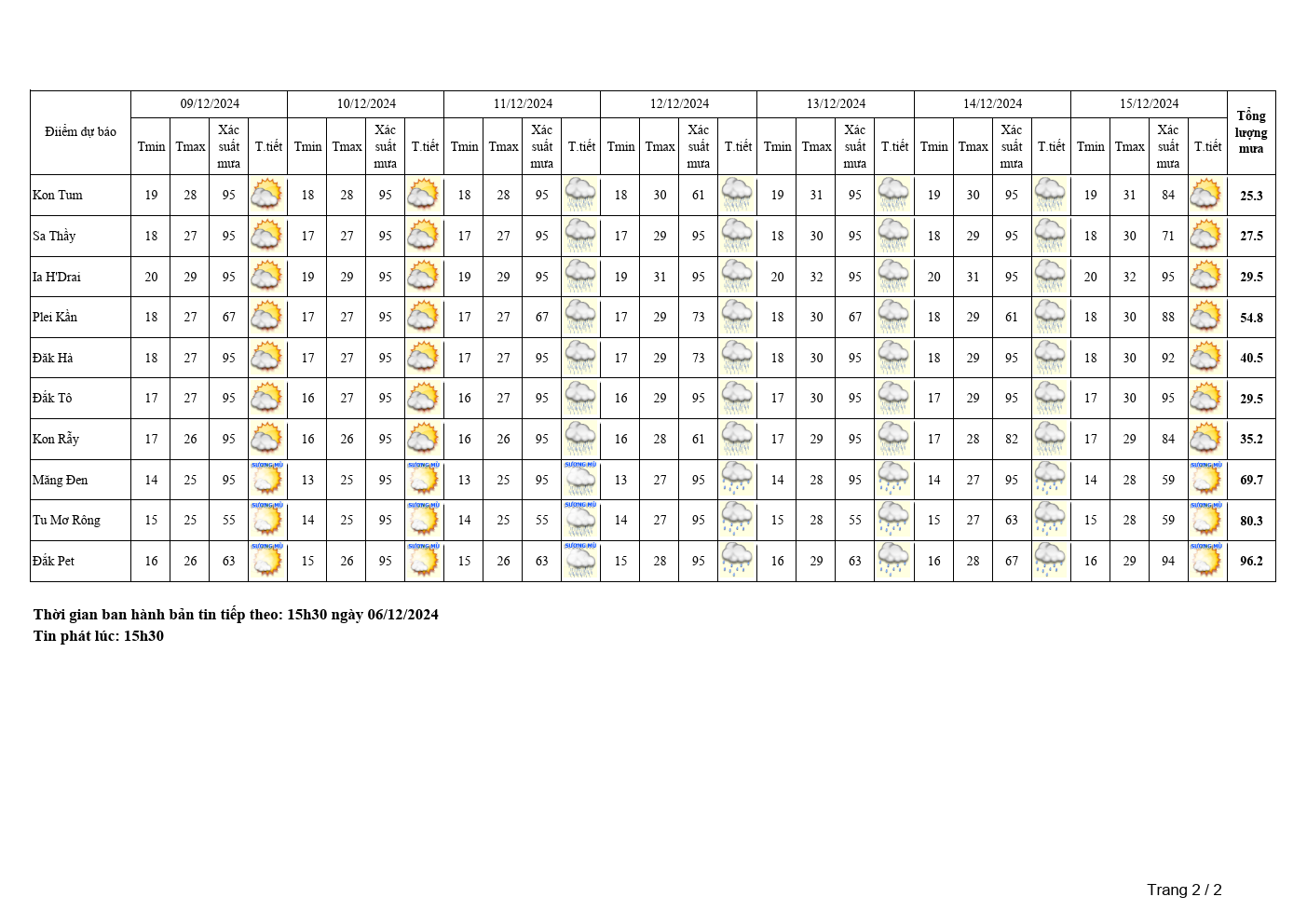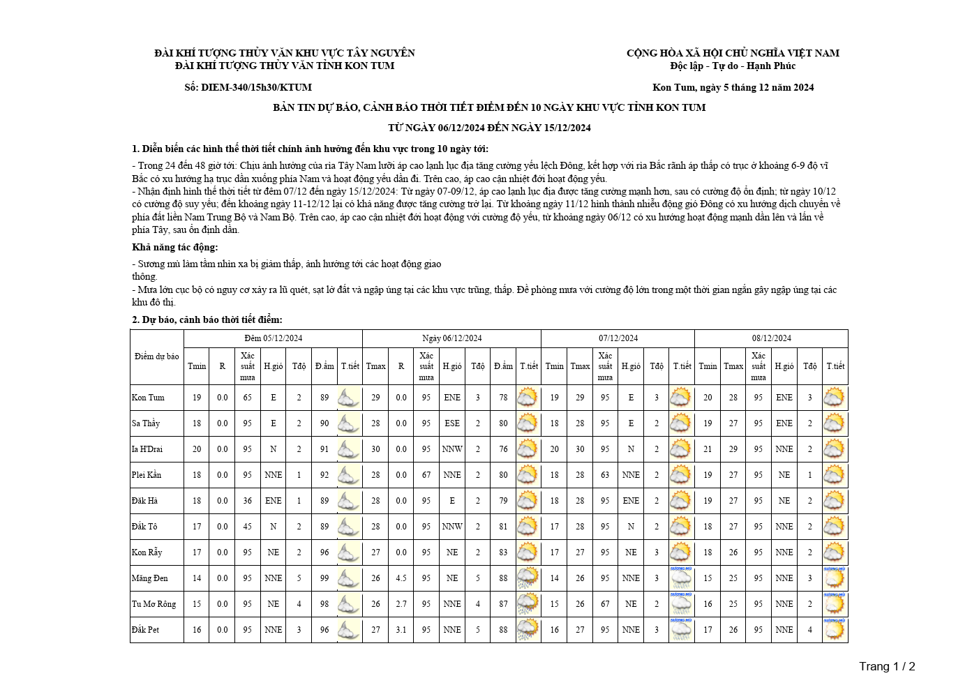 BẢN TIN DỰ BÁO, CẢNH BÁO THỜI TIẾT ĐIỂM ĐẾN 10 NGÀY KHU VỰC TỈNH KON TUM