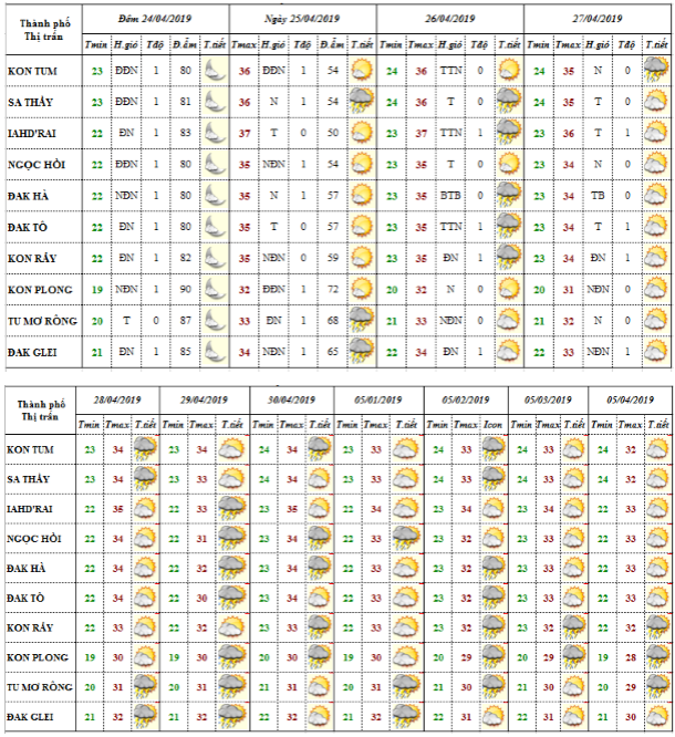 BẢN TIN DỰ BÁO THỜI TIẾT ĐIỂM TỪ NGÀY 25/4 ĐẾN NGÀY 04/5 NĂM 2019