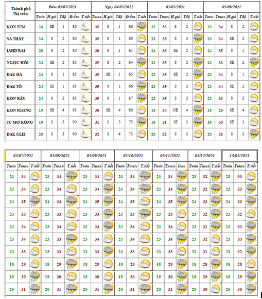 BẢN TIN THỜI TIẾT 10 NGÀY CÁC HUYỆN VÀ TP KON TUM