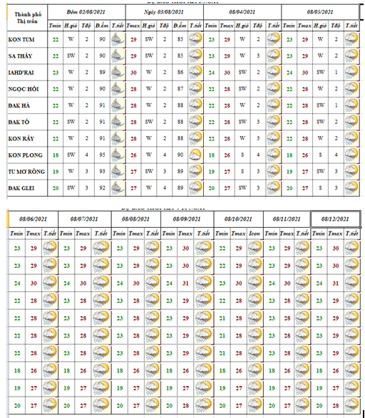 BẢN TIN THỜI TIẾT 10 NGÀY CÁC HUYỆN VÀ TP KON TUM