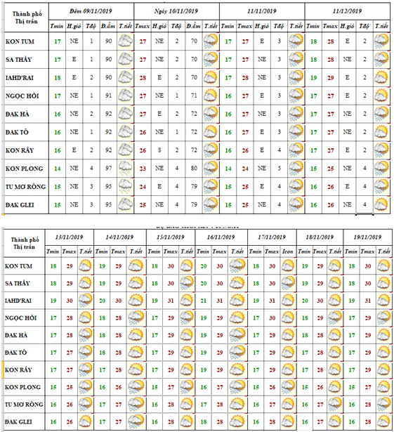 BẢN TIN THỜI TIẾT ĐIỂM CÁC HUYỆN VÀ TP. KON TUM, TRONG 10 NGÀY TỚI