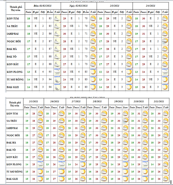 BẢN TIN DỰ BÁO THỜI TIẾT ĐIỂM 10 NGÀY CÁC HUYỆN VÀ TP. KON TUM