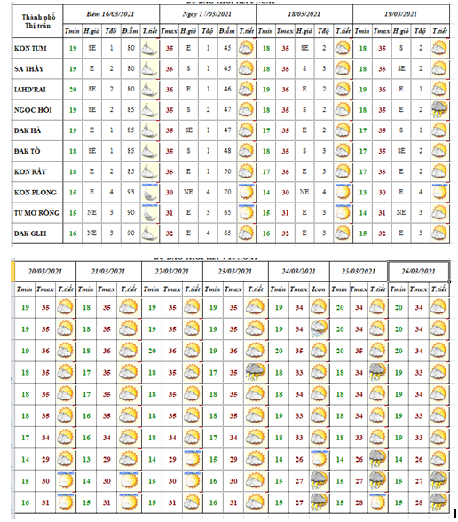 BẢN TIN THỜI TIẾT CÁC HUYỆN VÀ TP KON TUM TRONG 10 NGÀY TỚI