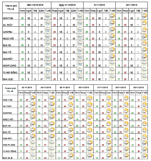 BẢN TIN THỜI TIẾT ĐIỂM CÁC HUYỆN VÀ TP. KON TUM, TRONG 10 NGÀY TỚI