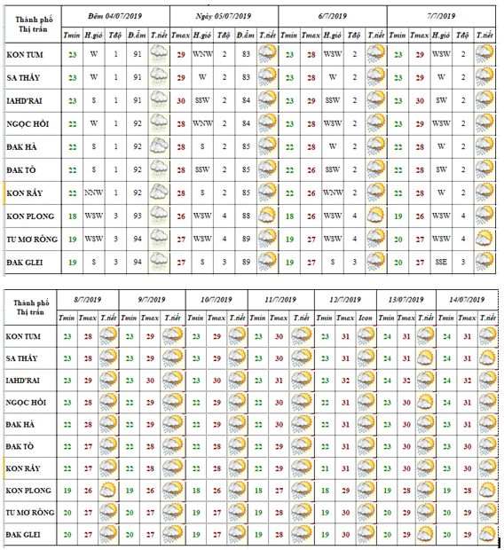 DỰ BÁO THỜI TIẾT TỈNH KON TUM ĐÊM 04 NGÀY 05 THÁNG 7 NĂM 2019