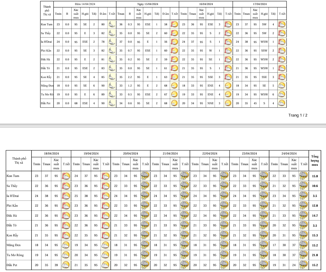 BẢN TIN DỰ BÁO THỜI TIẾT, THỦY VĂN TỈNH KON TUM Đêm 15 ngày 16 tháng 4 năm 2024
