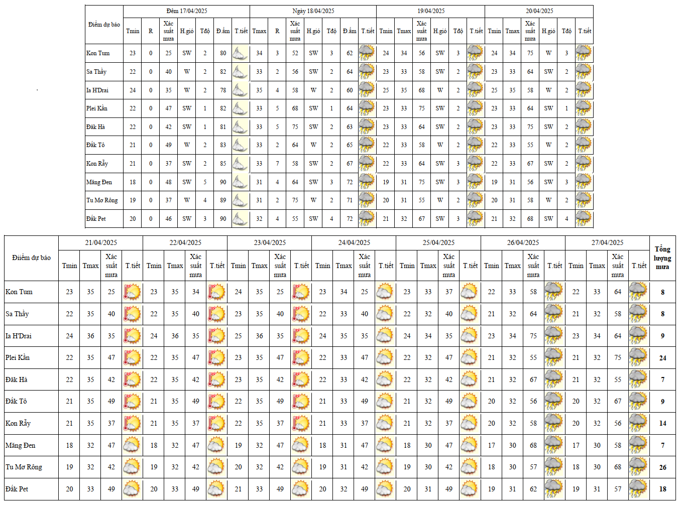 BẢN TIN DỰ BÁO, CẢNH BÁO THỜI TIẾT ĐIỂM ĐẾN 10 NGÀY KHU VỰC TỈNH KON TUM