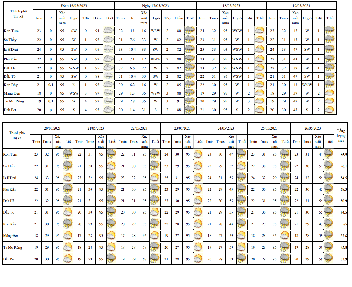 BẢN TIN DỰ BÁO THỜI TIẾT, THỦY VĂN TỈNH KON TUM Đêm 15 ngày 16 tháng 05 năm 2023