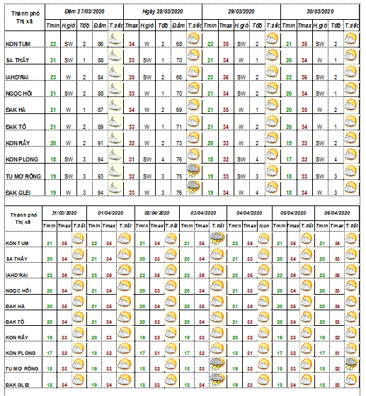 DỰ BÁO THỜI TIẾT TỈNH KON TUM ĐÊM 28 NGÀY 29 THÁNG 03 NĂM 2020