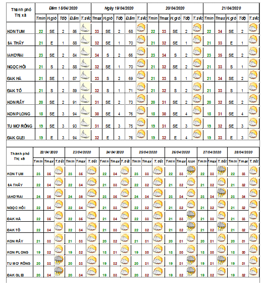 DỰ BÁO KHÍ TƯỢNG THUỶ VĂN TỪ NGÀY 21 ĐẾN NGÀY 30 THÁNG 4 NĂM 2020 CÁC KHU VỰC TRÊN PHẠM VI TỈNH KON TUM