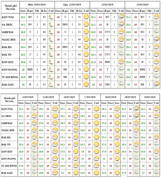 DỰ BÁO THỜI TIẾT TỈNH KON TUM ĐÊM 20 NGÀY 21 THÁNG 03 NĂM 2019
