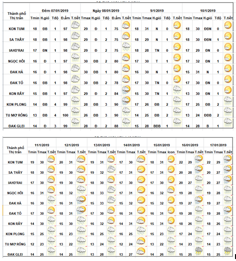 DỰ BÁO THỜI TIẾT TỈNH KON TUM ĐÊM 07 NGÀY 08 THÁNG 01 NĂM 2019
