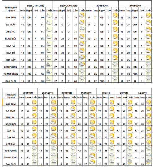DỰ BÁO THỜI TIẾT TỈNH KON TUM ĐÊM 27 NGÀY 28 THÁNG 01 NĂM 2019
