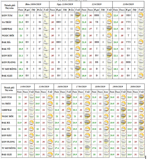 DỰ BÁO KHÍ TƯỢNG THUỶ VĂN TỪ NGÀY 11 ĐẾN NGÀY 20 THÁNG 4 NĂM 2019 CÁC KHU VỰC TRÊN PHẠM VI TỈNH KON TUM