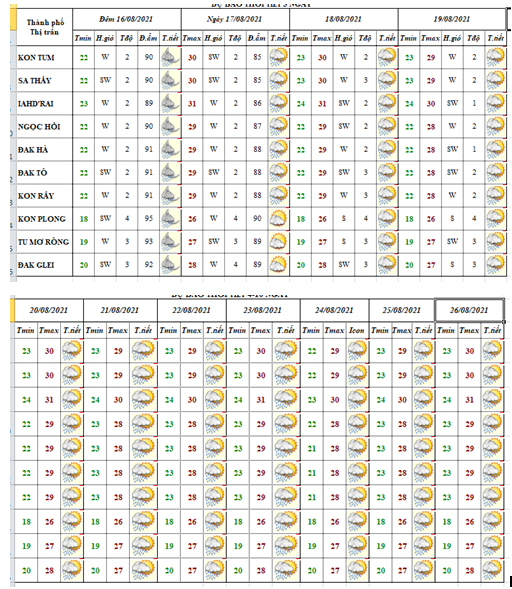 BẢN TIN THỜI TIẾT 10 NGÀY CÁC HUYỆN VÀ TP KON TUM