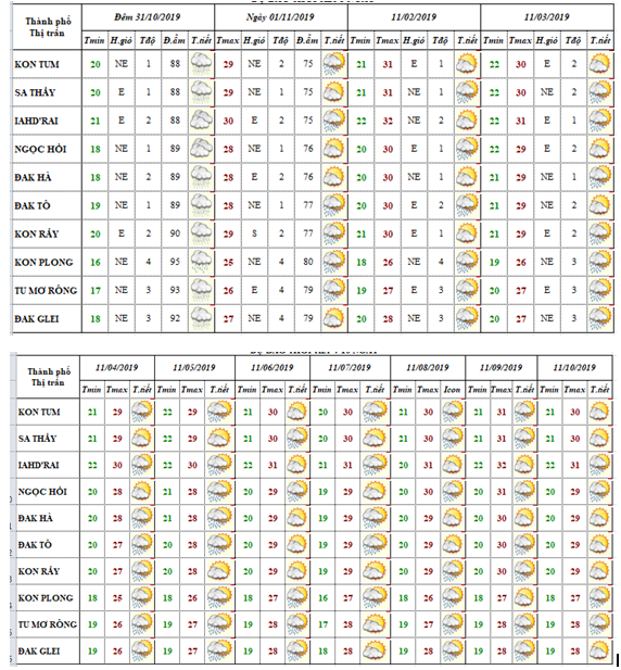 DỰ BÁO THỜI TIẾT TỈNH KON TUM ĐÊM 31.10 NGÀY 01 THÁNG 11 NĂM 2019