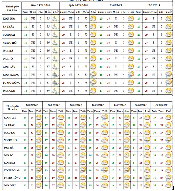 DỰ BÁO THỜI TIẾT TỈNH KON TUM ĐÊM 30.11 NGÀY 01 THÁNG 12 NĂM 2019