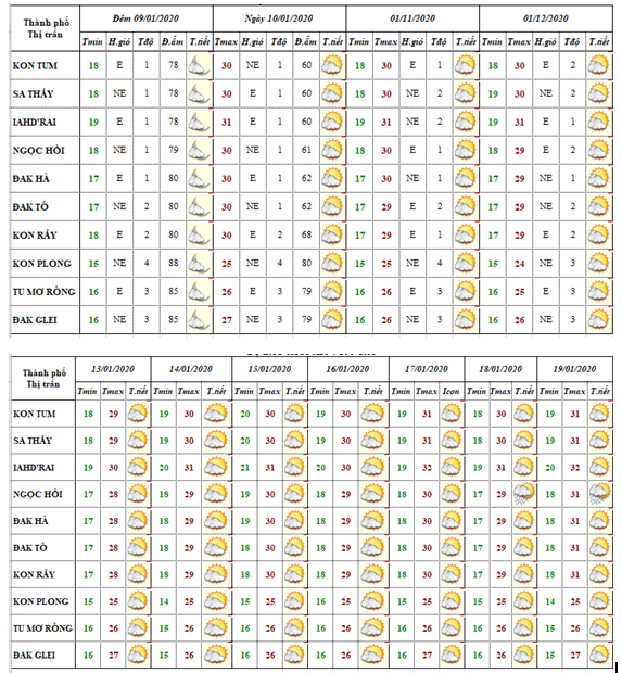 DỰ BÁO THỜI TIẾT TỈNH KON TUM ĐÊM 08 NGÀY 09 THÁNG 01 NĂM 2020