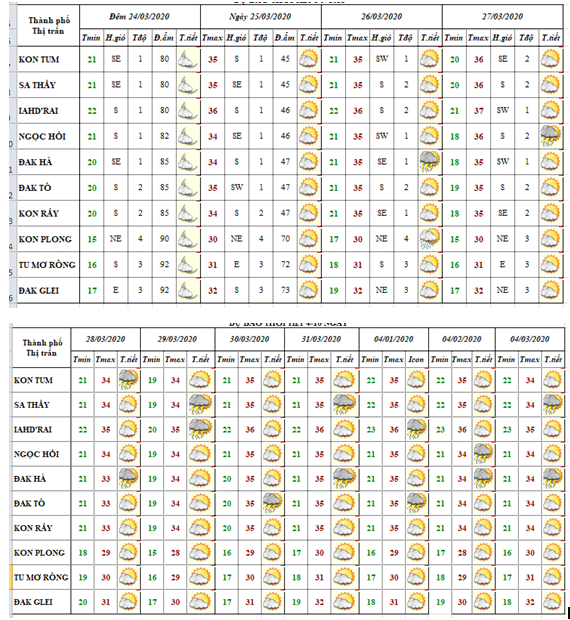 DỰ BÁO THỜI TIẾT TỈNH KON TUM ĐÊM 24 NGÀY 25 THÁNG 03 NĂM 2020