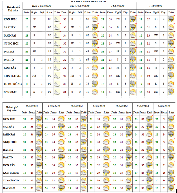DỰ BÁO THỜI TIẾT TỈNH KON TUM ĐÊM 14 NGÀY 15 THÁNG 04 NĂM 2020