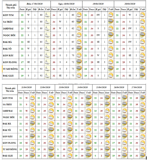 DỰ BÁO THỜI TIẾT TỈNH KON TUM ĐÊM 16 NGÀY 17 THÁNG 4 NĂM 2020