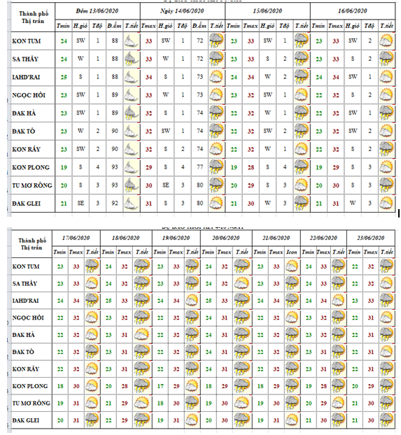 DỰ BÁO THỜI TIẾT TỈNH KON TUM ĐÊM 13 NGÀY 14 THÁNG 06 NĂM 2020