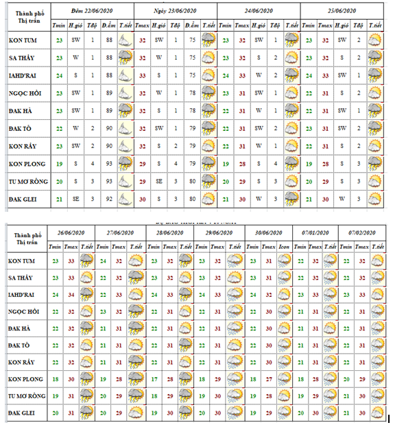 DỰ BÁO THỜI TIẾT TỈNH KON TUM ĐÊM 22 NGÀY 23 THÁNG 06 NĂM 2020