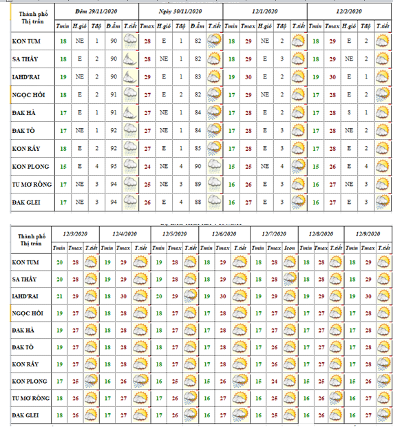 DỰ BÁO THỜI TIẾT TỈNH KON TUM ĐÊM 29 NGÀY 30 THÁNG 11 NĂM 2020