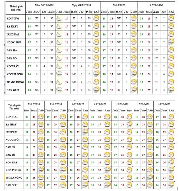 DỰ BÁO THỜI TIẾT TỈNH KON TUM ĐÊM 08 NGÀY 09 THÁNG 12 NĂM 2020