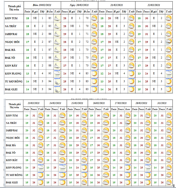 DỰ BÁO THỜI TIẾT TỈNH KON TUM ĐÊM 19 NGÀY 20 THÁNG 02 NĂM 2021