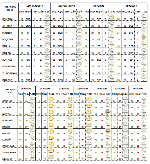 DỰ BÁO KHÍ TƯỢNG THUỶ VĂN TỪ NGÀY 21 ĐẾN NGÀY 31 THÁNG 12 NĂM 2018 CÁC KHU VỰC TRÊN PHẠM VI TỈNH KON TUM