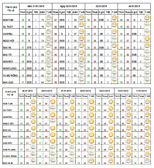 DỰ BÁO THỜI TIẾT TỈNH KON TUM ĐÊM 03 NGÀY 04 THÁNG 01 NĂM 2019
