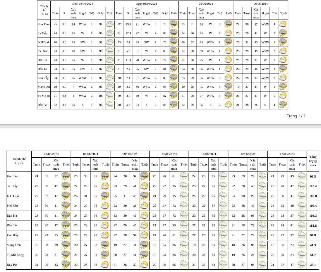 BẢN TIN DỰ BÁO, CẢNH BÁO THỜI TIẾT ĐIỂM ĐẾN 10 NGÀY KHU VỰC TỈNH KON TUM TỪ NGÀY 03/06/2024 ĐẾN NGÀY 12/06/2024