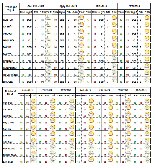 DỰ BÁO THỜI TIẾT TỈNH KON TUM ĐÊM 16 NGÀY 17 THÁNG 01 NĂM 2019