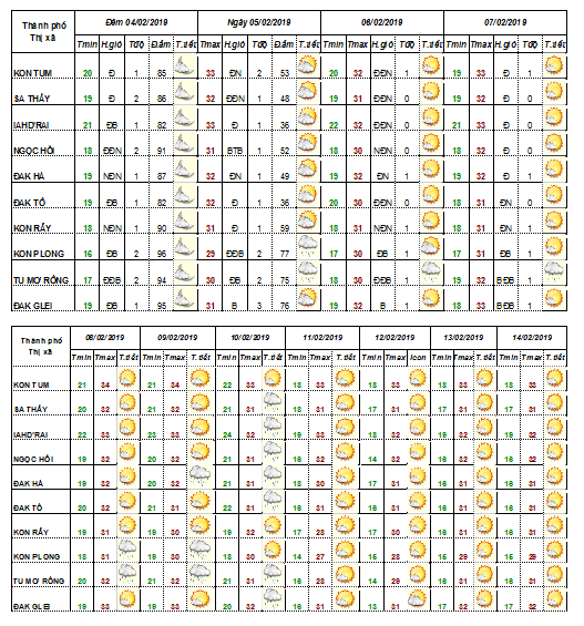 DỰ BÁO THỜI TIẾT TỈNH KON TUM ĐÊM 06 NGÀY 07 THÁNG 02 NĂM 2019