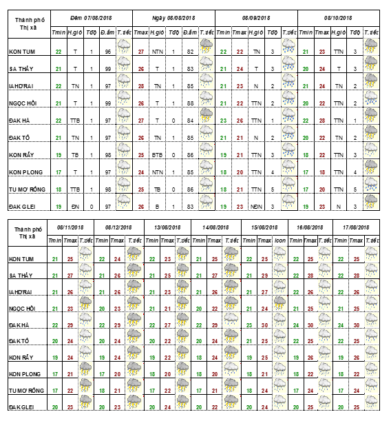 DỰ BÁO THỜI TIẾT TỈNH KON TUM ĐÊM 08 NGÀY 09 THÁNG 8 NĂM 2018