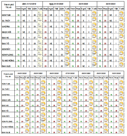 DỰ BÁO THỜI TIẾT TỈNH KON TUM ĐÊM 30 NGÀY 31 THÁNG 12 NĂM 2019