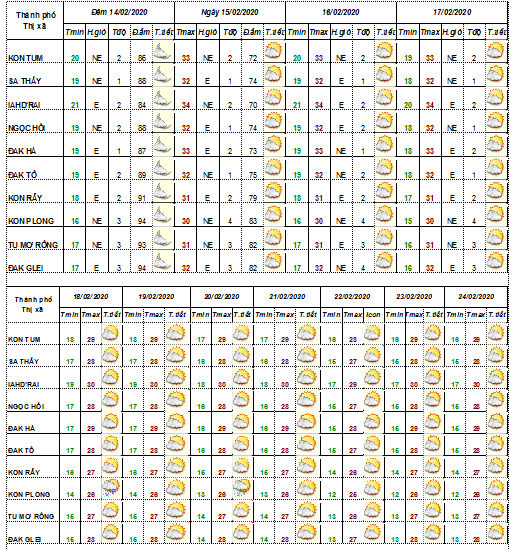 DỰ BÁO THỜI TIẾT TỈNH KON TUM ĐÊM 13 NGÀY 14 THÁNG 02 NĂM 2020