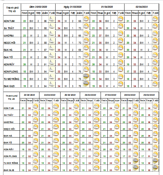 DỰ BÁO THỜI TIẾT TỈNH KON TUM ĐÊM 31.03 NGÀY 01 THÁNG 04 NĂM 2020