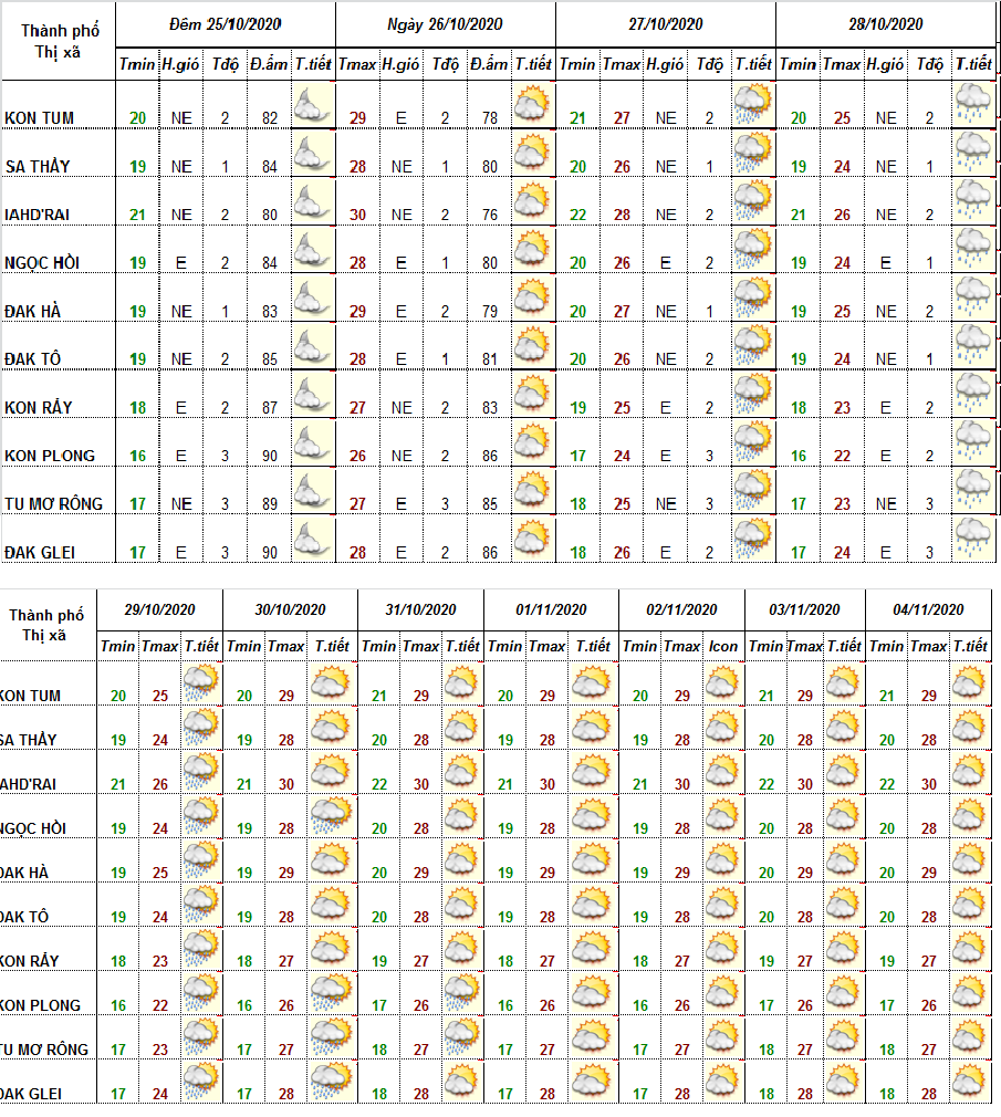 DỰ BÁO THỜI TIẾT TỈNH KON TUM ĐÊM 24 NGÀY 25 THÁNG 10 NĂM 2020