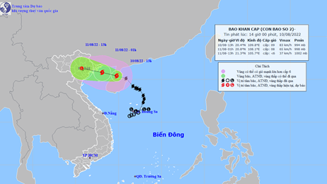Dự báo: Trong 12 giờ tới, bão di chuyển chủ yếu theo hướng Tây Tây Bắc, mỗi giờ đi được 15-20km. Đến 01 giờ ngày 11/8, vị trí tâm bão ở khoảng 20,8 độ Vĩ Bắc; 108,1 độ Kinh Đông, trên vùng biển các tỉnh Quảng Ninh-Nam Định. Sức gió mạnh nhất vùng gần tâm bão mạnh cấp 8 (62-74km/giờ), giật cấp 10.