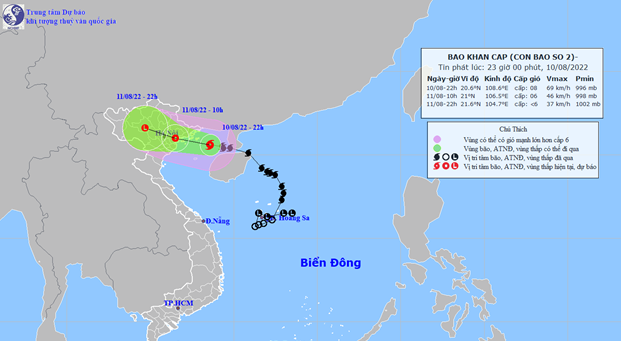 Hồi 22 giờ ngày 10/8, vị trí tâm bão ở vào khoảng 20,6 độ Vĩ Bắc; 108,6 độ Kinh Đông, trên khu vực phía Đông Bắc vịnh Bắc Bộ, cách đảo Bạch Long Vĩ khoảng 140km về phía Đông Bắc, cách Quảng Ninh khoảng 150km về phía Đông Nam, cách Nam Định 250km về phía Đông. Sức gió mạnh nhất vùng gần tâm bão mạnh cấp 8 (62-74km/giờ), giật cấp 10. Bán kính gió mạnh cấp 6, giật cấp 8 khoảng 100km tính từ tâm bão.