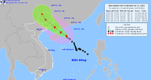 Dự báo: Trong 12 giờ tới, bão di chuyển chủ yếu theo hướng Tây Bắc, mỗi giờ đi được 15-20km và có khả năng mạnh thêm. Đến 10 giờ ngày 02/7, vị trí tâm bão ở khoảng 20,5 độ Vĩ Bắc; 111,3 độ Kinh Đông. Sức gió mạnh nhất vùng gần tâm bão mạnh cấp 12 (118-133km/giờ), giật cấp 15.
