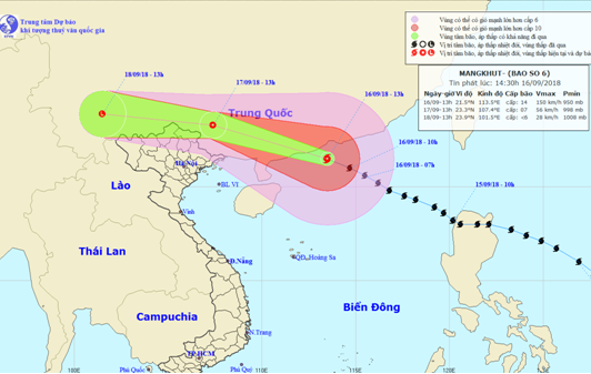 Dự báo: Trong 24 giờ tới bão di chuyển theo hướng Tây Tây Bắc, mỗi giờ đi được 25-30km, chiều nay (16/9) bão số 6 sẽ đi vào đất liền phía Nam tỉnh Quảng Đông (Trung Quốc) và suy yếu dần thành áp thấp nhiệt đới. Đến 13 giờ ngày 17/9, vị trí tâm áp thấp nhiệt đới ở khoảng 23,3 độ Vĩ Bắc; 107,4 độ Kinh Đông, trên đất liền phía Nam tỉnh Quảng Tây (Trung Quốc). Sức gió mạnh nhất vùng gần tâm áp thấp nhiệt đới mạnh cấp 7 (50-60km/giờ), giật cấp 9. Phạm vi gió mạnh cấp 6, giật cấp 8 trở lên khoảng 100km tính từ vùng tâm áp thấp nhiệt đới.
