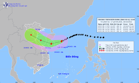 | Hình: Bản đồ dự báo quỹ đạo và cường độ bão số 6 lúc 17h00 ngày 18/10/2022 |