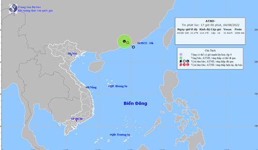 Hồi 16 giờ, vị trí trung tâm vùng áp thấp ở vào khoảng 23,2 độ Vĩ Bắc; 114,1 độ Kinh Đông. Sức gió mạnh nhất ở trung tâm vùng áp thấp giảm xuống dưới cấp 6 (dưới 40km/giờ).