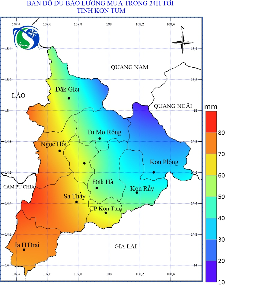 3. Cảnh báo: Từ 48 giờ đến 72 giờ tới trên địa bàn tỉnh Kon Tum tiếp tục có mưa, mưa vừa, có nơi mưa to và dông. Tổng lượng mưa khả năng đạt từ 40 - 70mm, có nơi trên 80mm. Mưa lớn trên địa bàn tỉnh Kon Tum có khả năng kéo dài trong nhiều ngày tới.