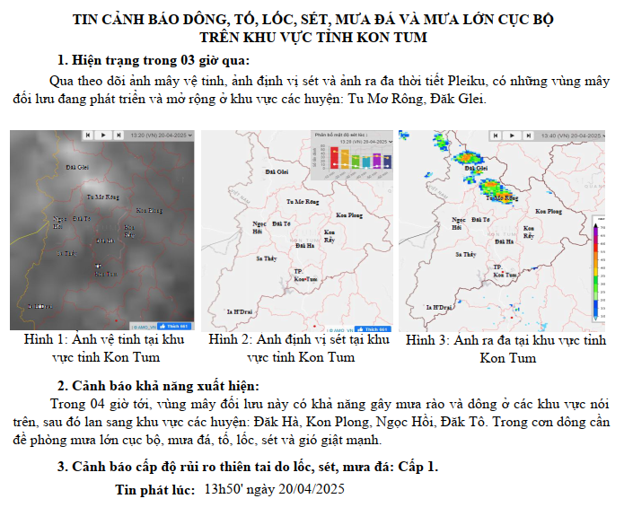 TIN CẢNH BÁO DÔNG, TỐ, LỐC, SÉT, MƯA ĐÁ VÀ MƯA LỚN CỤC BỘ TRÊN KHU VỰC TỈNH KON TUM