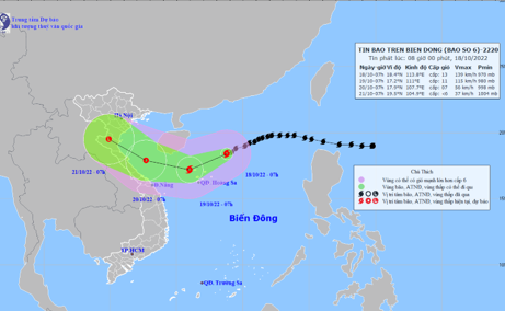 | 07h/20/10/2022 | Tây Tây Nam, 10-15 km/h | 17,9N-107,7E; cách Quảng Bình 120km về phía Đông, cách Hà Tĩnh 150km về phía Đông Nam | cấp 7, giật cấp 9 | 15,0-21,0N; Phía Tây kinh tuyến 114,0E | Cấp 3: khu vực Bắc Biển Đông; khu vực Nam vịnh Bắc Bộ, vùng biển từ Quảng Trị đến Quảng Nam |