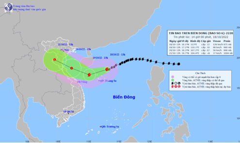 | 13h/20/10/2022 | Tây Tây Bắc, 10-15 km/h | 18,3N-107,2E; trên vùng biển Hà Tĩnh-Quảng Bình | cấp 6-7, giật cấp 9 | 15,0-21,0N; Phía Tây kinh tuyến 114,0E | Cấp 3: vùng biển phía Tây khu vực Bắc Biển Đông; khu vực Nam vịnh Bắc Bộ, vùng biển từ Quảng Trị đến Quảng Nam |